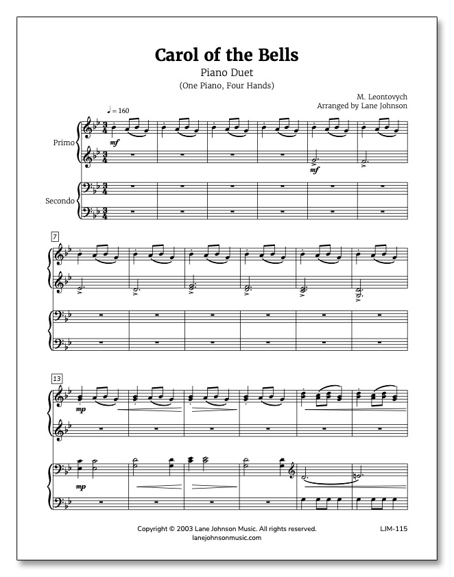 Carol of the Bells is a one piano, four-hands arrangement of the popular M. Leontovych Christmas piece. This arrangement is a real crowd pleaser with many opportunities for expression, a harmonic surprise, and a fun ending!