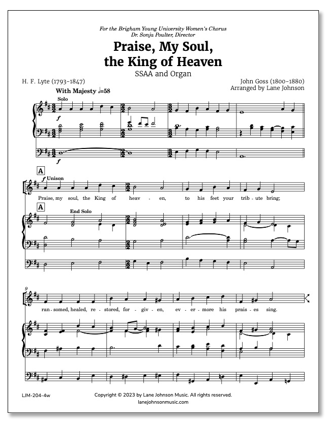 "Praise, My Soul, the King of Heaven" is a stirring arrangement of the beloved Christian hymn. It draws its text from Psalm 103 and was written by Anglican clergyman Henry Francis Lyte. It was first published in 1834.
