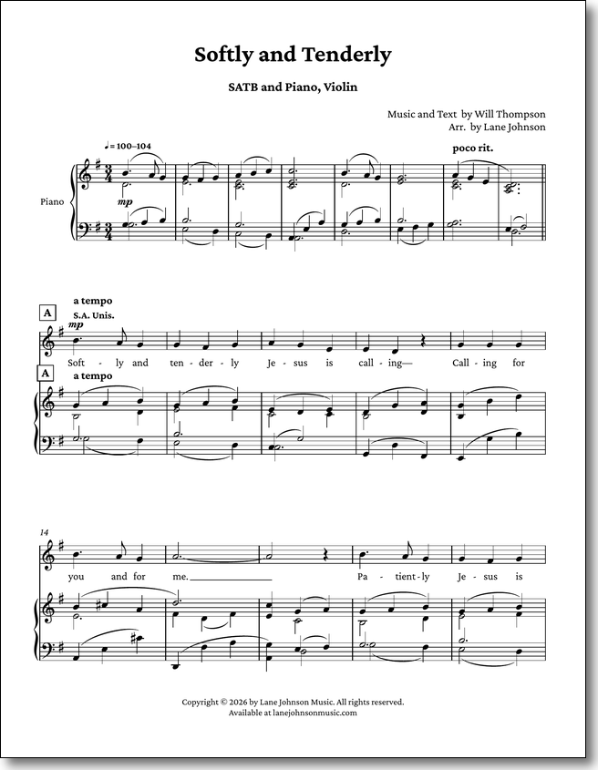 In this new setting for SATB, piano, and violin, I wanted to honor that quiet earnestness. The violin adds a warm, singing melody above the choir while the piano provides a steady, peaceful foundation beneath it — together creating an atmosphere that is prayerful without being heavy.