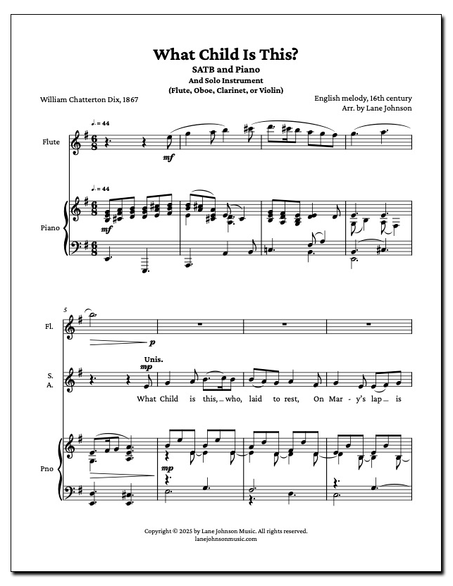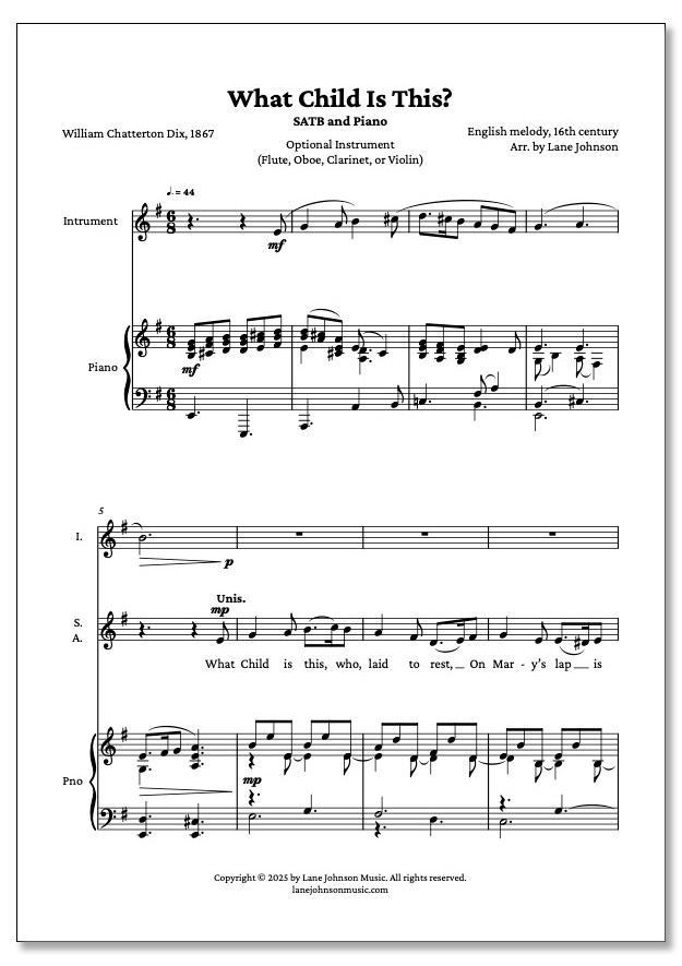 The beautiful and melancholic melody was paired with new sacred lyrics by William Chatterton Dix, a British poet and hymn writer. His lyrics transform the tune into a deeply reverent and contemplative Christmas hymn, sung from the perspective of onlookers at the Nativity. This SATB arrangement seeks to honor the rich history of both the melody and its lyrics, presenting them in a new light while preserving the timeless beauty and emotional depth that has made this Christmas carol a classic.