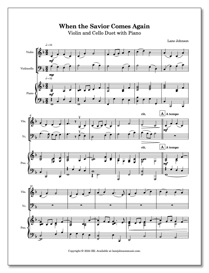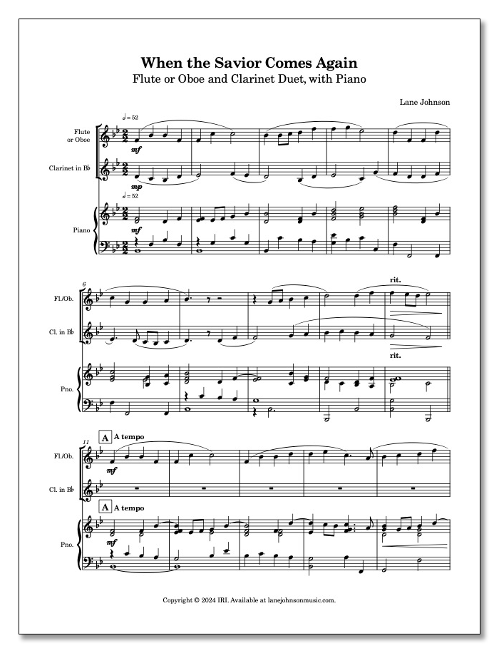 Instrumental arrangements with piano accompaniment available for: Violin and Cello, Flute or Oboe and Clarinet